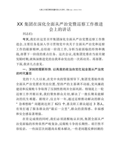 【七哥公文】2025年:XX集团在深化全面从严治党暨巡察工作推进会上的讲话+更多免费公文+VX:QiGeGongWen2024