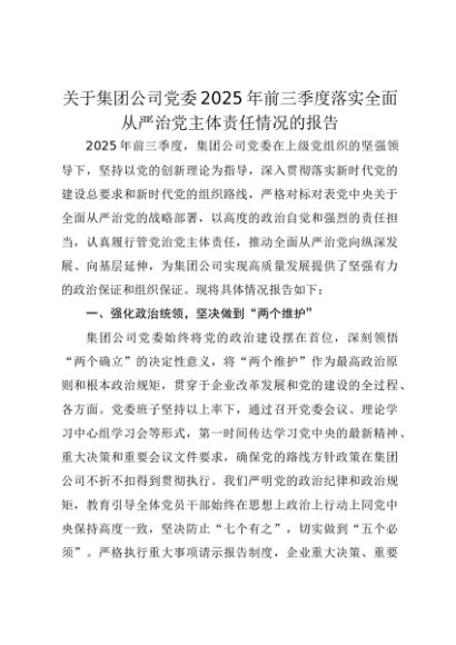 【七哥公文】2025年:关于集团公司党委2025年前三季度落实全面从严治党主体责任情况的报告+更多免费公文+VX:QiGeGongWen2024