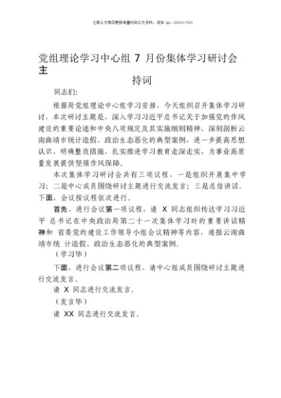 / 【七哥公文】2025年:党组理论学习中心组7月份集体学习研讨会主持词+更多免费公文+VX:QiGeGongWen2024