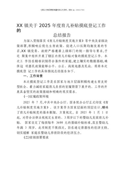 【七哥公文】2025年:XX镇关于2025年度育儿补贴摸底登记工作的总结报告+更多免费公文+VX:QiGeGongWen2024