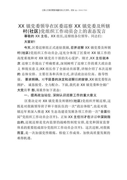【七哥公文】2025年:XX镇党委领导在区委巡察XX镇党委及所辖村(社区)党组织工作动员会上的表态发言+更多免费公文+VX:QiGeGongWen2024