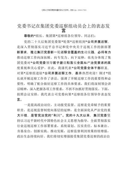 / 【七哥公文】2025年:党委书记在集团党委巡察组动员会上的表态发言+更多免费公文+VX:QiGeGongWen2024