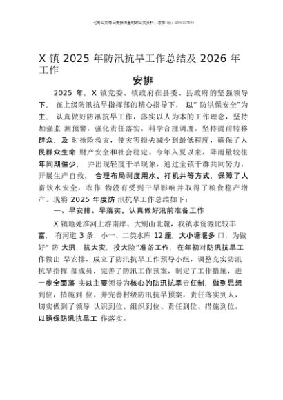 【七哥公文】2025年:X镇2025年防汛抗旱工作总结及2026年工作安排+更多免费公文+VX:QiGeGongWen2024