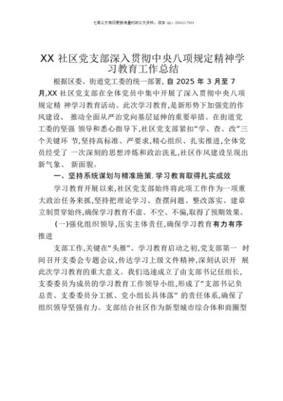 【七哥公文】2025年:XX社区党支部深入贯彻中央八项规定精神学习教育工作总结+更多免费公文+VX:QiGeGongWen2024