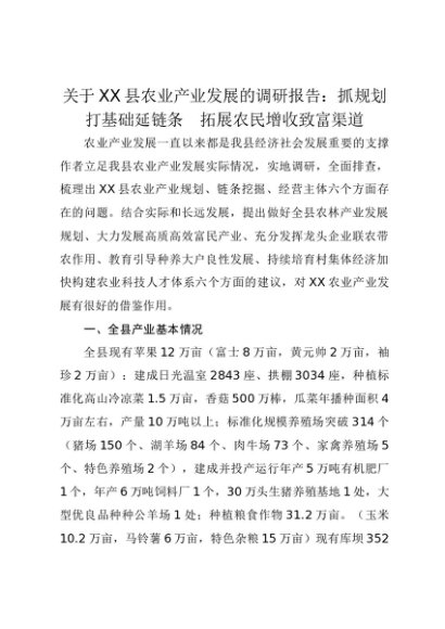 【七哥公文】2025年:关于XX县农业产业发展的调研报告:抓规划打基础延链条 拓展农民增收致富渠道+更多免费公文+VX:QiGeGongWen2024