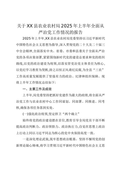 【七哥公文】2025年:关于XX县农业农村局2025年上半年全面从严治党工作情况的报告+更多免费公文+VX:QiGeGongWen2024