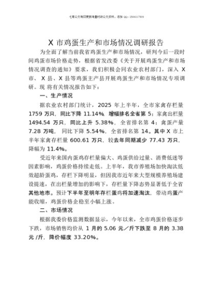 【七哥公文】2025年:X市鸡蛋生产和市场情况调研报告+更多免费公文+VX:QiGeGongWen2024