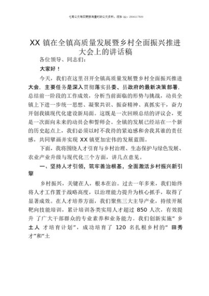 【七哥公文】2025年:XX镇在全镇高质量发展暨乡村全面振兴推进大会上的讲话稿+更多免费公文+VX:QiGeGongWen2024