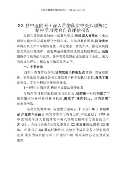 【七哥公文】2025年:XX县中医院关于深入贯彻落实中央八项规定精神学习教育自查评估报告+更多免费公文+VX:QiGeGongWen2024