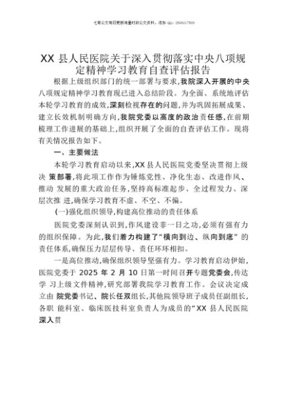 【七哥公文】2025年:XX县人民医院关于深入贯彻落实中央八项规定精神学习教育自查评估报告+更多免费公文+VX:QiGeGongWen2024