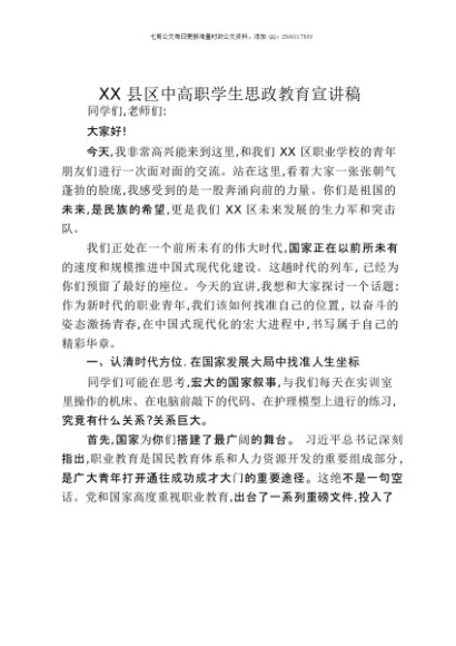 / 【七哥公文】2025年:XX县区中高职学生思政教育宣讲稿+更多免费公文+VX:QiGeGongWen2024