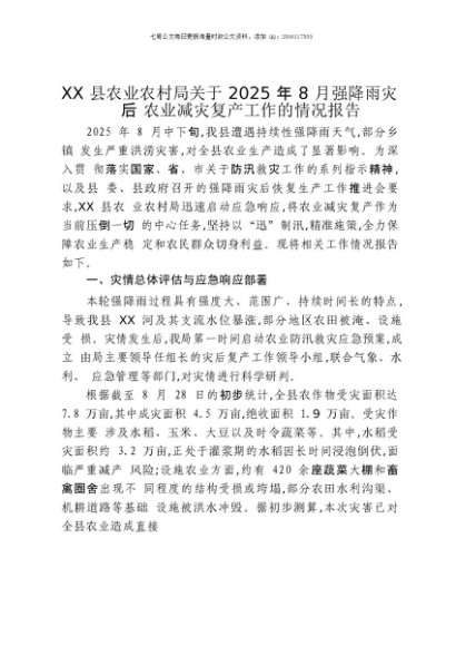 【七哥公文】2025年:XX县农业农村局关于2025年8月强降雨灾后农业减灾复产工作的情况报告+更多免费公文+VX:QiGeGongWen2024