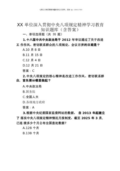 【七哥公文】2025年:XX单位深入贯彻中央八项规定精神学习教育知识题库(含答案)+更多免费公文+VX:QiGeGongWen2024