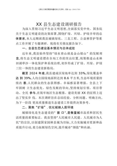 / 【七哥公文】2025年:XX县生态建设调研报告+更多免费公文+VX:QiGeGongWen2024