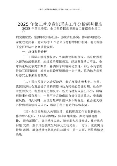 / 【七哥公文】2025年:2025年第三季度意识形态工作分析研判报告+更多免费公文+VX:QiGeGongWen2024
