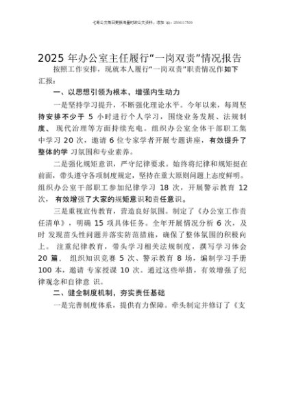 / 【七哥公文】2025年:2025年办公室主任履行“一岗双责”情况报告+更多免费公文+VX:QiGeGongWen2024