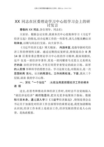 【七哥公文】2025年:XX同志在区委理论学习中心组学习会上的研讨发言(《习近平经济文选》第一卷)+更多免费公文+VX:QiGeGongWen2024
