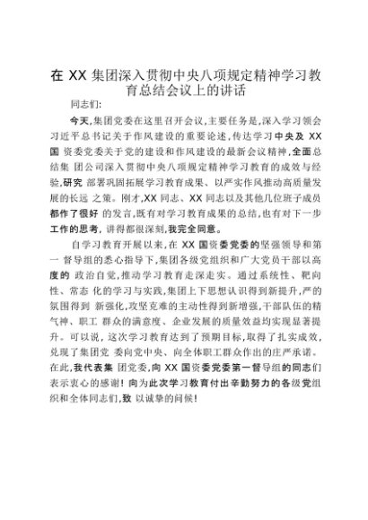 【七哥公文】2025年:在XX集团深入贯彻中央八项规定精神学习教育总结会议上的讲话_20250917_192233+更多免费公文+VX:QiGeGongWen2024