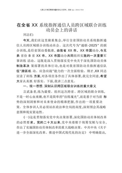 【七哥公文】2025年:在全省XX系统指挥通信人员跨区域联合训练动员会上的讲话+更多免费公文+VX:QiGeGongWen2024