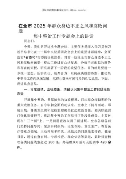 【七哥公文】2025年:在全市2025年群众身边不正之风和腐败问题集中整治工作专题会上的讲话+更多免费公文+VX:QiGeGongWen2024