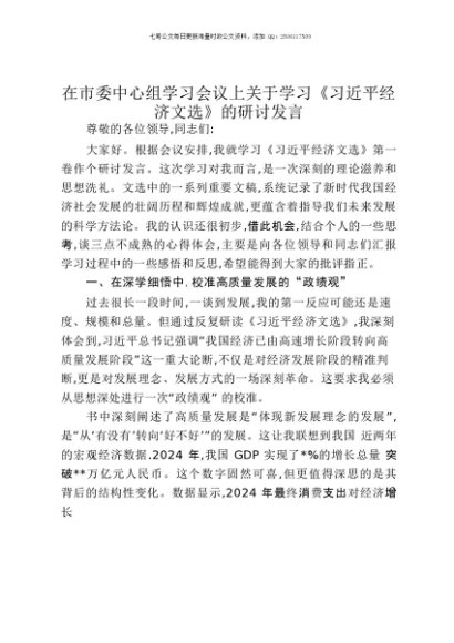 【七哥公文】2025年:在市委中心组学习会议上关于学习《习近平经济文选》的研讨发言+更多免费公文+VX:QiGeGongWen2024