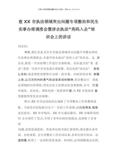 【七哥公文】2025年:在XX市执法领域突出问题专项整治和民生实事办理调度会暨涉企执法“亮码入企”培训会上的讲话+更多免费公文+VX:QiGeGongWen2024