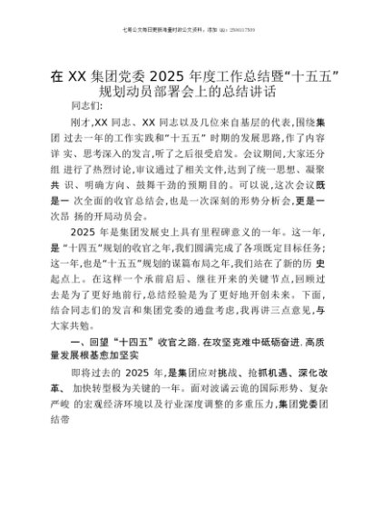 【七哥公文】2025年:在XX集团党委2025年度工作总结暨“十五五”规划动员部署会上的总结讲话+更多免费公文+VX:QiGeGongWen2024