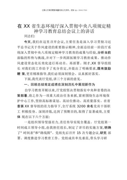 【七哥公文】2025年:在XX省生态环境厅深入贯彻中央八项规定精神学习教育总结会议上的讲话+更多免费公文+VX:QiGeGongWen2024
