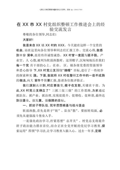 【七哥公文】2025年:在XX市XX村党组织整顿工作推进会上的经验交流发言+更多免费公文+VX:QiGeGongWen2024