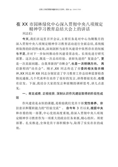 【七哥公文】2025年:在XX市园林绿化中心深入贯彻中央八项规定精神学习教育总结大会上的讲话+更多免费公文+VX:QiGeGongWen2024