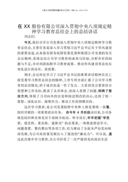【七哥公文】2025年:在XX股份有限公司深入贯彻中央八项规定精神学习教育总结会上的总结讲话+更多免费公文+VX:QiGeGongWen2024