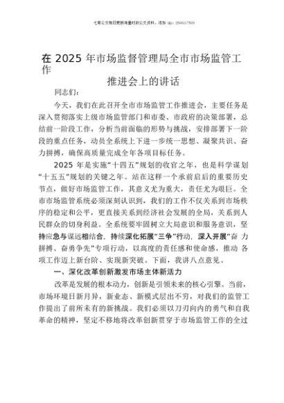 【七哥公文】2025年:在2025年市场监督管理局全市市场监管工作推进会上的讲话+更多免费公文+VX:QiGeGongWen2024