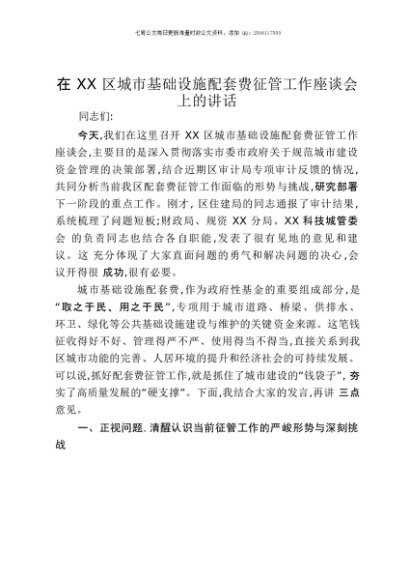 【七哥公文】2025年:在XX区城市基础设施配套费征管工作座谈会上的讲话+更多免费公文+VX:QiGeGongWen2024