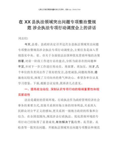 【七哥公文】2025年:在XX县执法领域突出问题专项整治暨规范涉企执法专项行动调度会上的讲话+更多免费公文+VX:QiGeGongWen2024