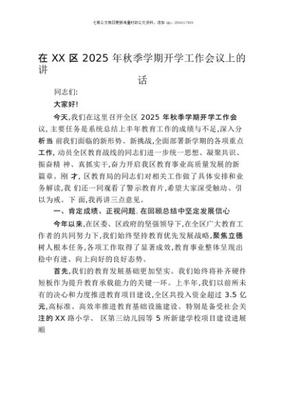 / 【七哥公文】2025年:在XX区2025年秋季学期开学工作会议上的讲话+更多免费公文+VX:QiGeGongWen2024