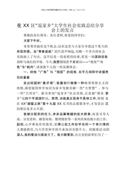 【七哥公文】2025年:在XX区“返家乡”大学生社会实践总结分享会上的发言+更多免费公文+VX:QiGeGongWen2024