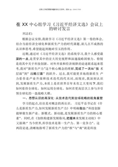 【七哥公文】2025年:在XX中心组学习《习近平经济文选》会议上的研讨发言+更多免费公文+VX:QiGeGongWen2024