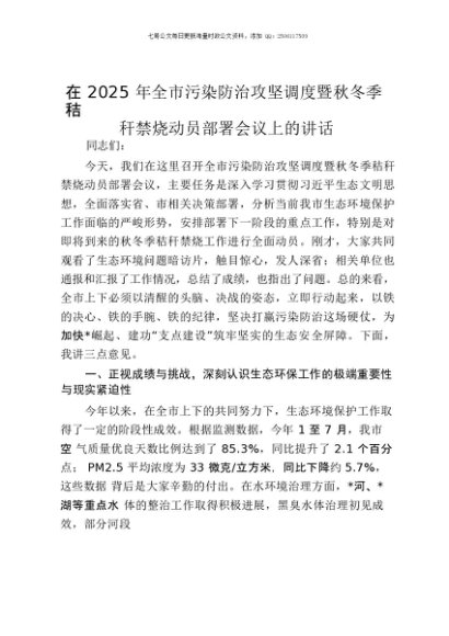【七哥公文】2025年:在2025年全市污染防治攻坚调度暨秋冬季秸秆禁烧动员部署会议上的讲话+更多免费公文+VX:QiGeGongWen2024