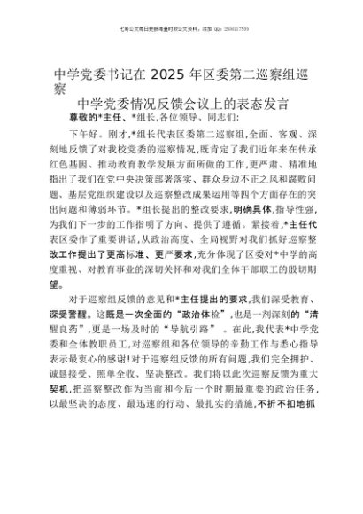 【七哥公文】2025年:中学党委书记在2025年区委第二巡察组巡察中学党委情况反馈会议上的表态发言+更多免费公文+VX:QiGeGongWen2024