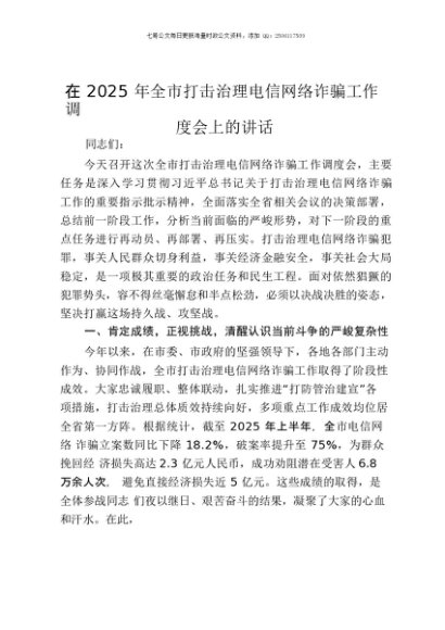 【七哥公文】2025年:在2025年全市打击治理电信网络诈骗工作调度会上的讲话+更多免费公文+VX:QiGeGongWen2024