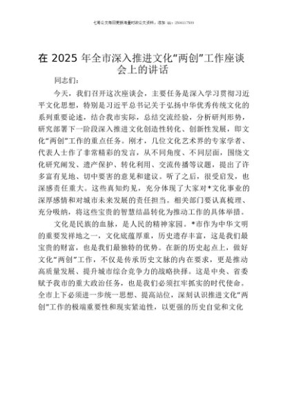 【七哥公文】2025年:在2025年全市深入推进文化“两创”工作座谈会上的讲话+更多免费公文+VX:QiGeGongWen2024
