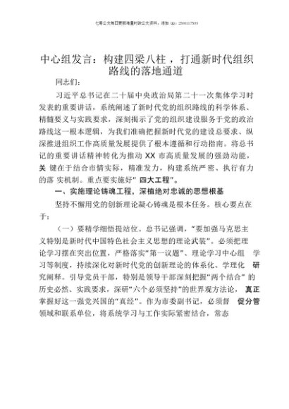 【七哥公文】2025年:中心组发言:构建四梁八柱,打通新时代组织路线的落地通道+更多免费公文+VX:QiGeGongWen2024
