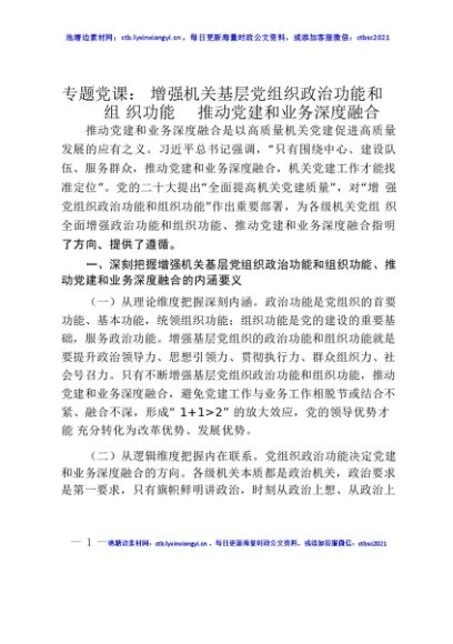 【七哥公文】2025年:专题党课讲稿:增强机关基层党组织政治功能和组织功能 推动党建和业务深度融合+更多免费公文+VX:QiGeGongWen2024