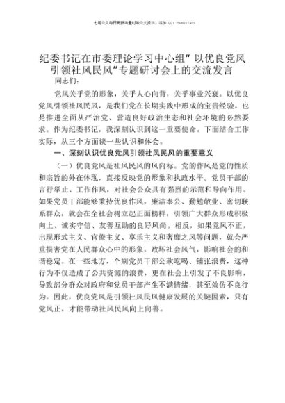 【七哥公文】2025年:纪委书记在市委理论学习中心组“以优良党风引领社风民风”专题研讨会上的交流发言+更多免费公文+VX:QiGeGongWen2024