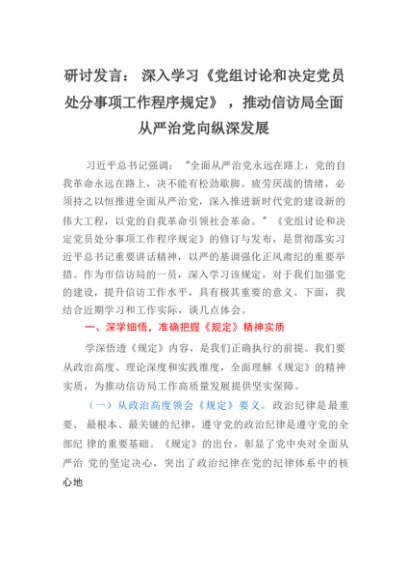 【七哥公文】2025年:研讨发言:深入学习《党组讨论和决定党员处分事项工作程序规定》,推动信访局全面从严治党向纵深发展_20250917_192236+更多免费公文+VX:QiGeGongWen2024