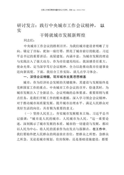 【七哥公文】2025年:研讨发言:践行中央城市工作会议精神,以实干铸就城市发展新辉煌+更多免费公文+VX:QiGeGongWen2024