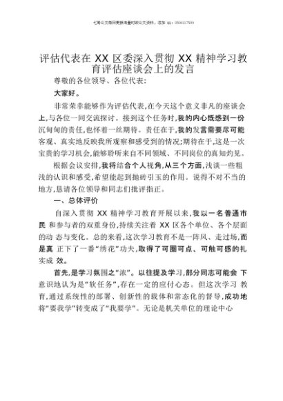 【七哥公文】2025年:评估代表在XX区委深入贯彻XX精神学习教育评估座谈会上的发言+更多免费公文+VX:QiGeGongWen2024