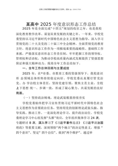 / 【七哥公文】2025年:某高中2025年度意识形态工作总结+更多免费公文+VX:QiGeGongWen2024