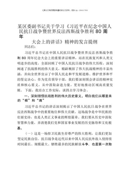 【七哥公文】2025年:某区委副书记关于学习《习近平在纪念中国人民抗日战争暨世界反法西斯战争胜利80周年大会上的讲话》精神的发言提纲+更多免费公文+VX:QiGeGongWen2024
