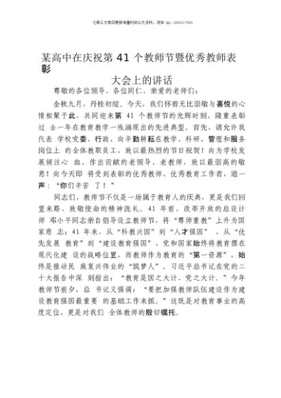 【七哥公文】2025年:某高中在庆祝第41个教师节暨优秀教师表彰大会上的讲话+更多免费公文+VX:QiGeGongWen2024